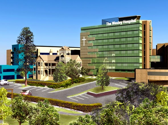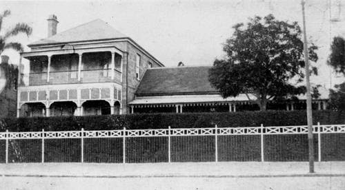 Construction of the Wesley Hospital at Auchenflower commenced in 1975 with the first patients arriving on 1 March 1977. It is run by UnitingCare Health and has over 500 beds as well as suites for medical specialists. The hospital stands on the former Moorlands site that was owned by the Mayne family, and the residence built by Mrs Mayne still stands there.Some people may not be aware that the Wesley Hospital had its origins across the river at South Brisbane where the Methodist Church had operated St Helen's Private Hospital for decades. A Dr. Charles Kebbell established StHelen'sHospitalin 1896, originally creating the hospital in the StHelen's Boarding House - a two storey building that was situated on the river side of Peel Street, South Brisbane. (Photo: JOL 96602) c1911