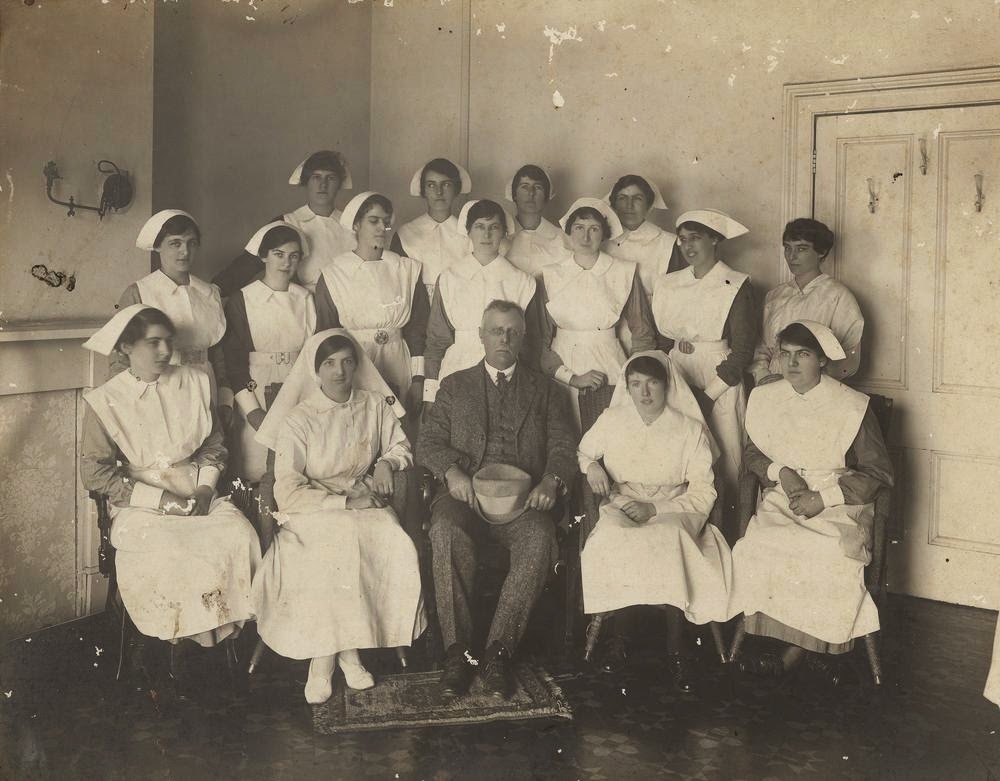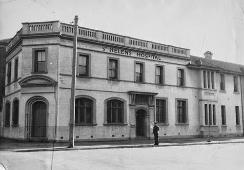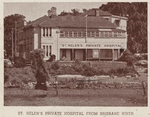 (Photo: JOL 202857) 1950 In 1900 the hospital was bought by Dr Ernest Sandford Jackson, formerly the medical superintendent at the Brisbane Hospital. Sandford Jackson was a founding father of the university medical school and founder of the (Royal) Australasian College of Surgeons Queensland branch. He had established Australia's first school of nursing at Brisbane Hospital and the nursing school he established at St Helen's was probably the first at a private facility. Here is a photo of the doctor with his St Helen's nurses.(Photo: SLQ 7979 St Helen's Methodist Hospital Photographs)Here is a pre-WWII picture of the hospital taken from the Brisbane River.