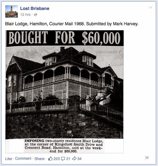 And in more recent history we can see a newspaper clipping recording the sale of the residence for $60,000 in 1968. The notional current value of that amount according to the RBA Inflation Calculator is just under $700,000 but my bet is that this piece of real estate would attract a far higher price than that if sold today.(Photo: https://www.facebook.com/Lost.Brisbane) 1968