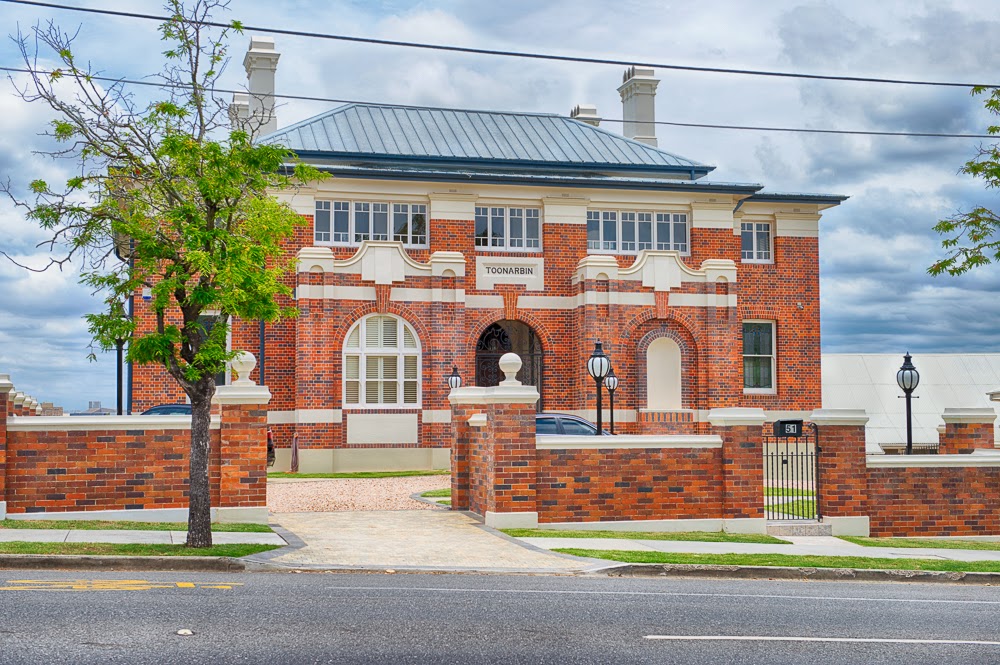 (Brisbane Courier 16 September 1868 via trove.nla.gov.au)O'Reilly engaged Backhouse to design a house for him on the property and the following photograph shows the original form of the residence. The name Toonarbin that Backhouse had bestowed on the land came originally from a Henry Kingsley novel, and it was applied to the house. Here is a photograph showing the early form of the house - note the ornate chimneys on each corner. (Photo: JOL 98162)O'Reilly lived at Toonarbin until his death in 1877, and his wife and children continued to live there for a considerable time after that. His son Charles O"Reilly was a customs agent and his bonded stores at Margaret St in Brisbane's CBD were recently demolished despite a call for them to be added to heritage lists. In 1926 Archbishop Duhig bought the property. Some of the land was sub-divided and sold off and the residence was converted to a convent for the Sisters of Mercy. Some improvements and alterations, including replacing the wooden balconies and facade with brick, took place then to cater for its new function.The building operated as a convent through to around 1995 and was then vacant for a dozen years until purchased by the current owners who set about restoring the building to its former glory. A labour of love over the ensuing years has Toonarbin looking like this. Although the structure has been enlarged and enclosed in brick, the chimneys provide external evidence of the building's origins.(Photo: © 2014 the foto fanatic)Proof of the success of the restoration is illustrated by the fact that Toonarbin won a High Commendation at the announcement of the National Trust's heritage awards for 2014.Click here for a Google Map.tffThis is our final post for 2014.Seasons Greetings to all readers!We will be back in 2015.