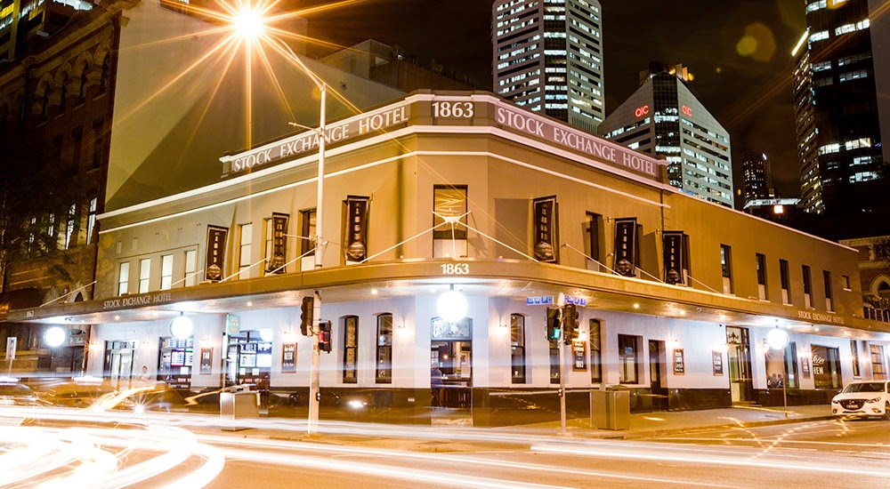 Over the ensuing years the hotel has been subtly altered from time to time in order to re-invent itself in the face of increasing competition and changing tastes. Like many of the other older hotel buildings, the verandahs have been removed and there is an abundance of advertising signage. In the photo below the 2011 rugby World Cup is the theme to lure patrons to the venue - the flags and the oversized football a somewhat kitsch statement.(BCC Heritage List) 2010In my photograph taken earlier this year the signs are a little less obtrusive and the exterior a little more muted.(Photo: © 2014 the foto fanatic) However, a visit to the hotel's web page just prior to posting this piece reveals more changes. The hotel has undergone a complete makeover in recent months, featuring a new look and new management. The date of the hotel's beginnings is featured, together with a name change.And, a blast from the past! It is now the Stock Exchange Hotel.(Photo: www.stockexchangehotel.com.au)