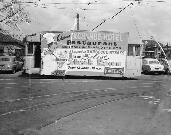 (JOL 100011) c1889 The following image was taken a decade later and shows the Exchange Hotel next to the Edwards Dunlop Building which in turn is listed on the Queensland government's heritage list. The sign at the front of the hotel proclaims Henry Biggs is now the proprietor.(Photo: BCC-B120-31063) 1908 When I started work in the city in the sixties, the Exchange Hotel was not quite the closest to the office where I worked, but the back beer garden of the Exchange became the favourite venue for the keg parties that were the standard office celebration for 21st birthdays, engagements and weddings, getting "called-up" (conscripted) or returning from the army, whether scathed or unscathed. In an office that contained several hundred mostly young workers there were plenty of opportunities to "tap" a keg, and we were frequent visitors. There was a "Select Steak Room" there too, as evidenced by the following tram advertisementfor Quinn's Exchange Hotel.(Photo: BCC-B54-14542) 1960