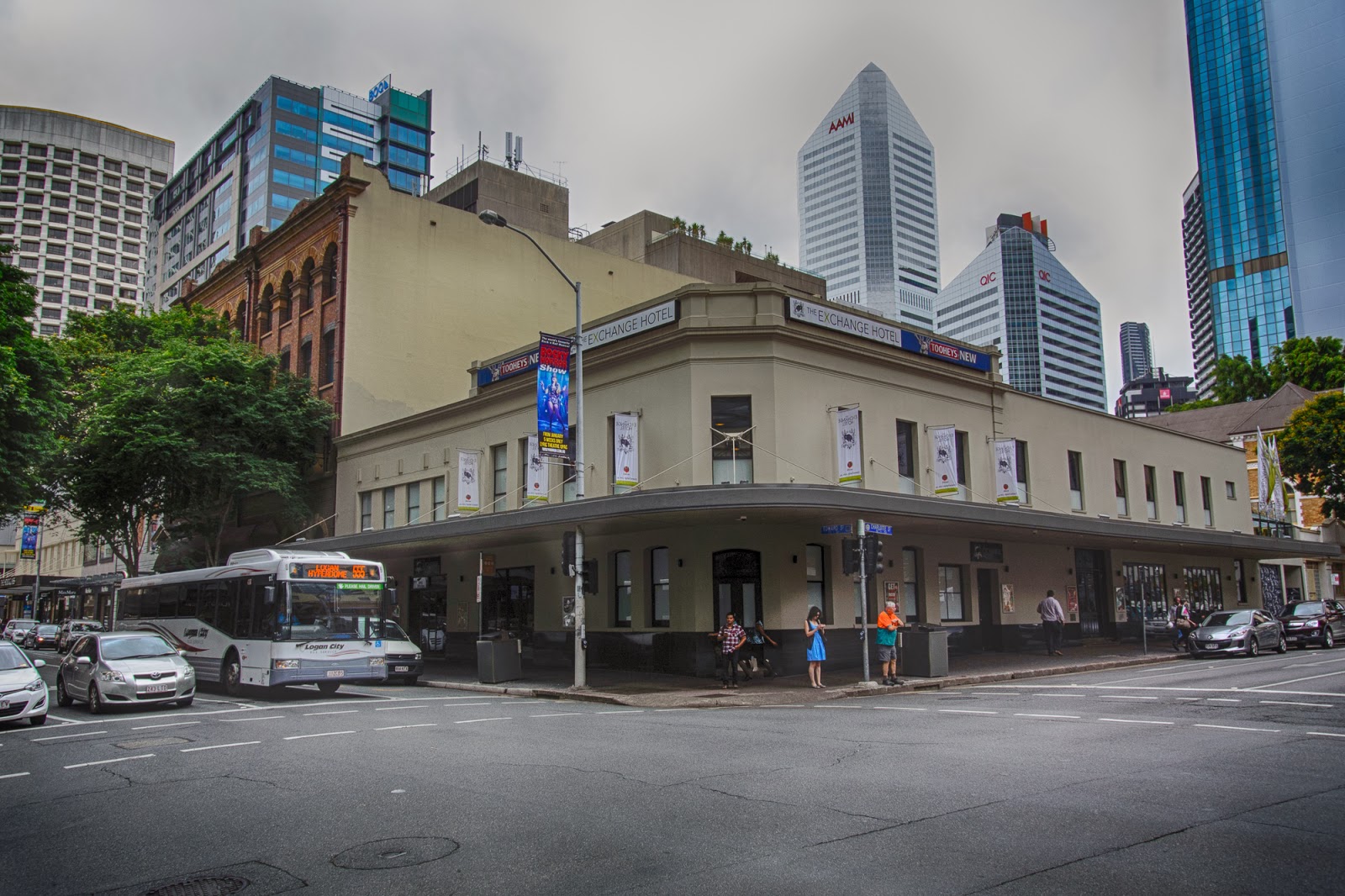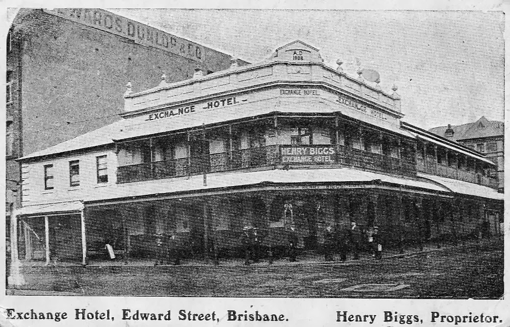 There are a few hotel names that bob up in many different towns, for example - the Railway, the Post Office, the Royal - and today's venue, the Exchange.In fact different versions of the name "Exchange" have existed in Brisbane hotels. The original Stock Exchange Hotel operated by Mrs Sarah Balls was situated in Queen St between Creek and Wharf Streets and the Royal Exchange Hotel that was owned at one time by Patrick Mayne was on the corner of Elizabeth and Albert Streets. Both of these have disappeared, although these days there is a Royal Exchange Hotel at Toowong. Remaining in the CBD is the Exchange Hotel on the corner of Edward and Charlotte Streets that was constructed in 1863 and is held on the Brisbane City Council's heritage list. Here is the earliest picture of it that I could find, taken in the late 1880s. It is taken from Elizabeth St looking up Edward St towards Spring Hill, and the Exchange is seen in part on the right side of the photo. There were some improvements made to the building in 1887 by architect John Ibler, and then when licensee Mr P Talty took over in 1897 he promised to make it an "up-to-date family hotel" with a "much altered and improved private bar". ![]()