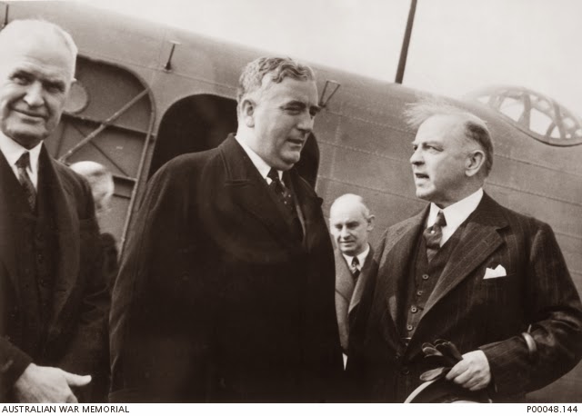 Later in that year, after his return to Australia, he ran for and was elected to the Senate. He become a minister in 1926, holding various portfolios until he lost his seat in 1936. In 1939 he became Australia's first High Commissioner to Canada. Here he is, left of picture, welcoming Australia's prime minister Robert Menzies (centre) to Canada in the company of Canada's prime minister, William Mackenzie King (right of picture).