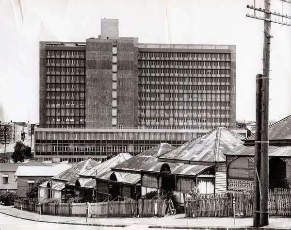 Here is the earliest photograph of the building that I could find. Taken by well-known heritage photographer Richard Stringer in 1968, the image counterpoints the Modernist Main Roads building with the Spring Hill workers' cottages that surrounded it then.